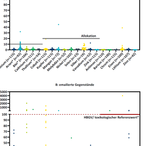 Es ist anzumerken, dass von insgesamt 194 Proben bei 24 Proben die Freisetzung eines einzigen Elementes den jeweiligen Grenzwert und bei 14 Proben die Freisetzung mehrerer Elemente die jeweiligen Grenzwerte überschritt. Am häufigsten überschritt die Aluminiumfreisetzung den Grenzwert (33 Proben). Die insgesamt hohe Anzahl an Proben (80,4 %), die alle Freisetzungsgrenzwerte einhalten, macht deutlich, dass die Herstellung solcher Produkte mit niedrigen Elementfreisetzungen möglich ist. Die Hersteller der Gegenstände mit zu hohen Elementfreisetzungen sollten ihre Rohstoffe und ihren Produktionsprozess entsprechend prüfen und anpassen, um die Elementfreisetzung weiter zu reduzieren.