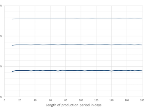 With weekly reporting of animal losses, the change of the farm-level treatment frequency compared to daily loss reporting is largely independent of the length of the production period. For three weekly animal loss rates (1%, 3%, 5%), the percentage change in treatment frequency was determined based on animal stock curves as shown in Figure 1.