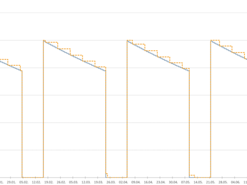 The days of the week on which regular animal entries and exits take place only lead to minor deviations from the described effect on the treatment frequency. This is also confirmed when the length of the production period and the length of the cleaning phases between cycles are varied. The weekly loss rate is always decisive for the effect on the change in the treatment frequency (see also Figure 2). However, according to the sources cited at the beginning, it can be assumed that in animal populations with longer production periods, the weekly loss rates are lower than in those with shorter production periods.