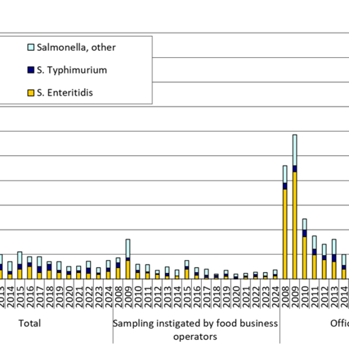 A total of 765 breeding flocks were tested as part of official control (2023: 930). No Salmonella was detected in any of the flocks in 2024 (Table 1), which represented an improvement on previous years (0.8 % in 2023, 0.5 % in 2022). In 2023, a control-relevant serovar was detected in two flocks (0.2 %) during official testing. These were S. Enteritidis and S. Typhimurium, respectively, while in 2022, S. Typhimurium was detected only once.