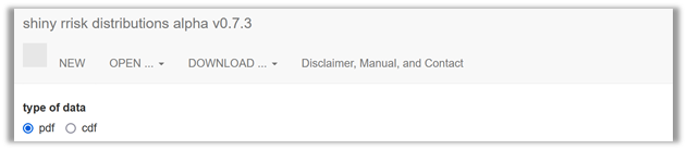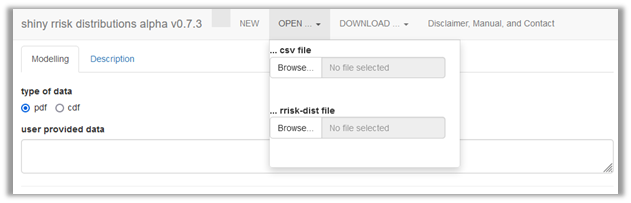 | OPEN | Open a csv-data file containing your original observations or a rrisk-dist file if you want to modify a distribution fitting project that you have created and downloaded. |