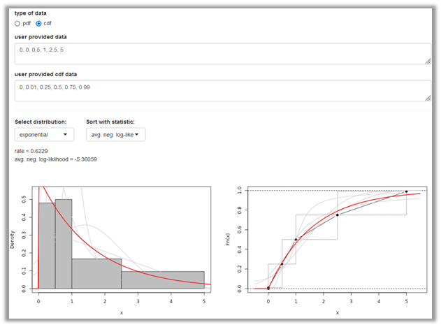 The user provided data can be entered manually as comma separated values using decimal point. The model that appears under Select distribution (here the log-normal) provides the best fit according to the selected Goodness-of-fit statistic (by default the average negative log likelihood). The fitted distribution parameters occur below. A panel with two distribution plots is shown. On the left, the entered data is shown as histogramme (grey) whereas on the right side the entered data points are shown in a cumulative distribution plot (black). In the two graphs, the selected fitted distribution is overlaid as density or distribution plot on the left and right side, respectively (red line). Other candidate distribution models are also shown (grey). You can choose alternative distributions and goodness-of-fit (GOF) statistics. Future versions of shiny distributions may provide a summary table with all candidate distributions and GOF statistics.