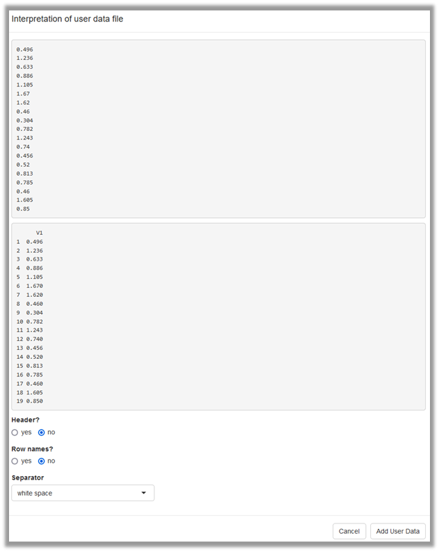 Alternatively, user provided data can be uploaded as csv file (Figure 3), which results in the same situation as the manual entry. During import of the data, you will confirm whether the data file contains column names or row names and specify the column separator (Figure 4).