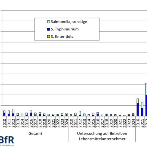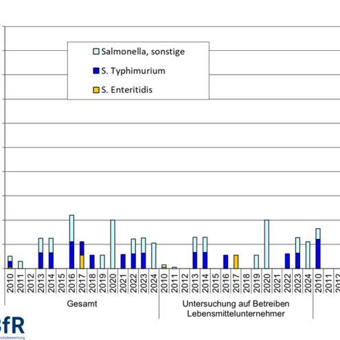 Obwohl im Jahr 2024 bei den untersuchten Herden von Zuchthühnern und Zuchtputen keine positiven Befunde für die bekämpfungsrelevanten Serovare registriert wurden, zeigten regelmäßige Untersuchungen in den Vorjahren, auch bereits während der Aufzucht, dass die Serovare S. Enteritidis und S. Typhimurium dort vorkommen können und, falls nicht rechtzeitig entdeckt, in die nachgelagerten Produktionslinien eingeschleppt werden können. Der Nachweis von S. Enteritidis und S. Typhimurium bei Legehennen, Masthähnchen und Mastputen bedarf weiterhin einer kontinuierlichen Überwachung. In allen drei Tier- und Nutzungsarten wurde im Jahr 2024 vermehrt S. Enteritidis und S. Typhimurium berichtet. Der Nachweis von S. Infantis bei Masthähnchen ist dagegen weiter gesunken, bei Zuchthühnern wurde das Serovar seit mehreren Jahren nicht nachgewiesen. Bei Masthähnchen zählt dieses Serovar nicht zu den bekämpfungsrelevanten Serovaren.