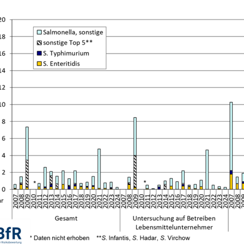 Bei den Elterntierherden der Mastrichtung lag die Salmonella-Nachweisrate im Jahr 2024 mit 0,2 % unter dem Wertebereich der vorherigen Jahre (2023: 0,7 %; 2022: 0,7 %; 2021: 6,5 %; 2020: 1,7 %). Auch hier ist also ein positiver Trend zu beobachten.