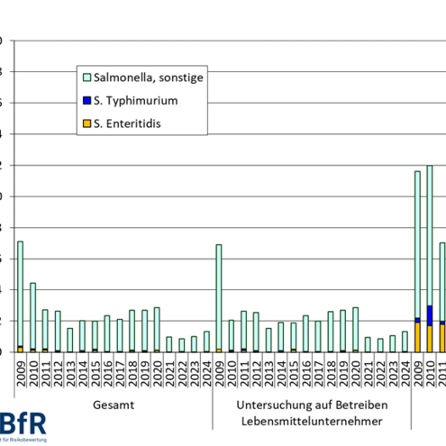 Als Teil des EU-weiten Programms zur Bekämpfung von Salmonellen sind die Mitgliedsstaaten verpflichtet, jedes Jahr einen Bericht zur aktuellen Situation zu verfassen. Dieser Bericht beschreibt den Anteil der Salmonella-positiven Herden bei Zuchtgeflügel (Gallus gallus), Legehennen, Masthähnchen sowie Zucht- und Mastputen. Ein spezielles Augenmerk wird hierbei auf den Nachweis ausgewählter Serovare mit besonderer Bedeutung für Infektionen des Menschen gelegt. Die für die Überwachungs- und Bekämpfungsmaßnahmen zuständigen Bundesländer übermitteln hierfür jährlich ihre Untersuchungsergebnisse aus der Beprobung auf Betreiben des Unternehmers sowie aus der Beprobung im Rahmen der amtlichen Überwachung. Der Bericht zum Bekämpfungsprogramm wird auf Grundlage dieser Daten jährlich vom Bundesinstitut für Risikobewertung (BfRkurz fürBundesinstitut für Risikobewertung) erstellt.